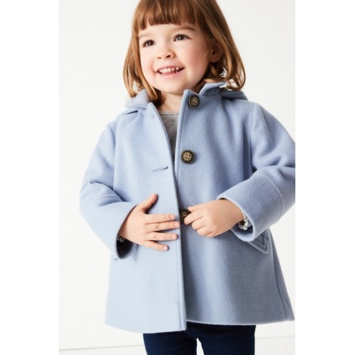 這款時尚的正裝大衣含有羊毛,保暖舒適,並有漂亮的印花襯裡,連帽,後褶和按鈕前扣。適合時尚小寶貝的一款超可愛外套。